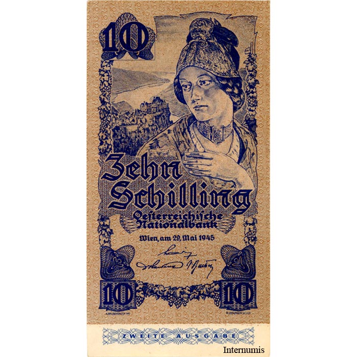 Österr.Nationalbank – 10 Schilling 1945 , 2. Ausgabe , Serie fett , (KK. 225a / P.115 / ANK 255a) Erh. I-