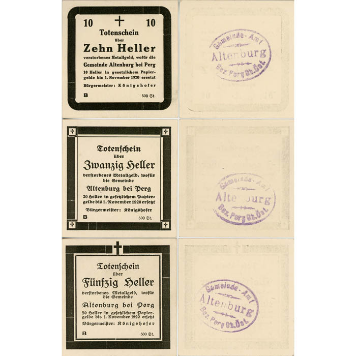 Altenburg/Perg (OÖ) – 10,20,50 Heller o.D.,(-1920), mit Bezeichnung **Totenscheine**, Kp. weiß, Vs.Dr.schwarz, Bst.B, 500 St., Rs.Gmst., (KKN.S26)III)aB) Erh. I