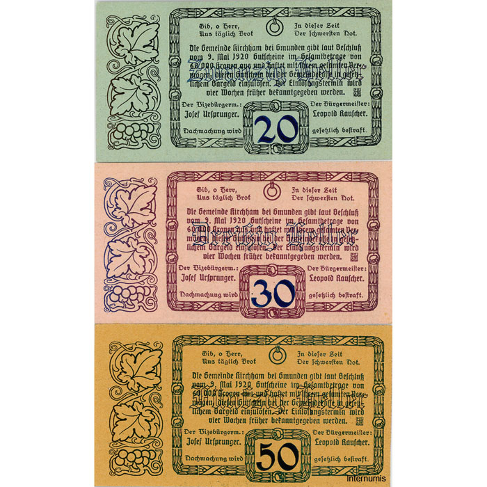 Kirchham(OÖ) – 20,30,50 Heller (-9.5.1920), III. Auflage, Bildseite: Aufdruck eines Rahmens von kleinen Quadraten in Gold, (KKN.S446)VII)g) Erh. I