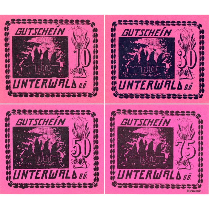 Unterwald(OÖ) – 10,30,50,75 Heller o.D., Papier rosa, Druck Bildseite schwarz, Zwergengruppe, (KKN.S1100)III)c) Erh. I-